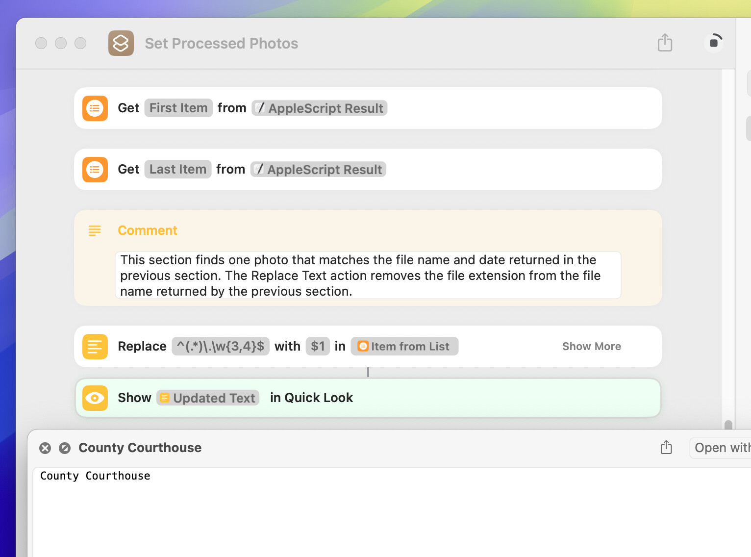 Another alternative is to change the second AppleScript to that shown below, and this would change both duplicates of “County Courthouse.jpg” to Processed. It would also change “County Courthouse Winter.jpg” and “County Courthouse.heic” to processed. Given the ultimate purpose of the shortcut, this might be a good approach.