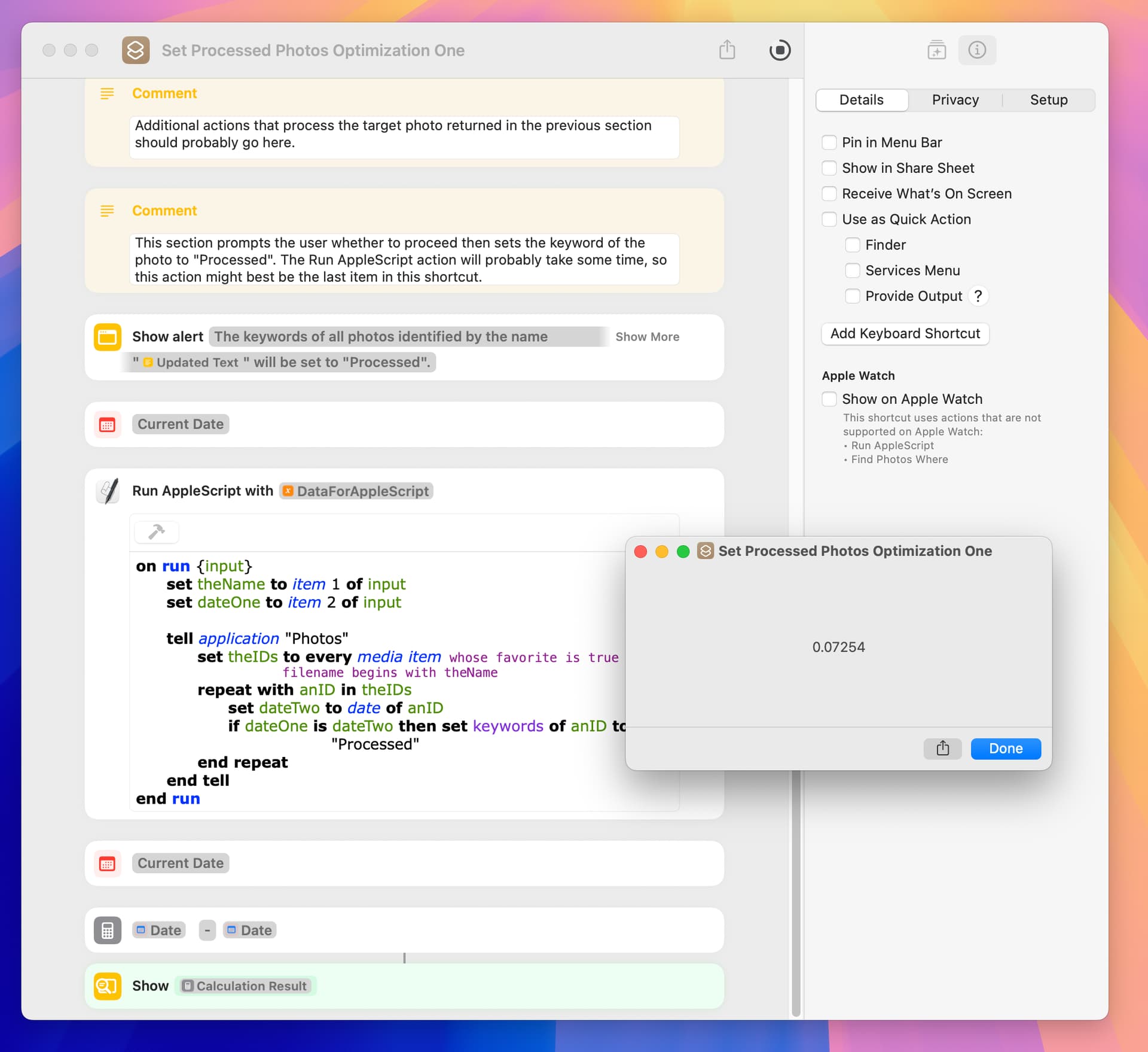 FWIW, the following shortcut simply works by setting the keyword of the photo identified in the first Run AppleScript action to “Processed”. This shortcut is about 25 percent faster as compared with the earlier optimized version. However, duplicates of a photo will not be set to “Processed”, and this would seem to make the shortcut unusable given its intended purpose. Of course, you may want to build into your final shortcut a Skip This Photo option, in which case this shortcut might be considered. Anyways, having a few additional approaches to consider is always a good thing, and I do like this new version for its simplicity.