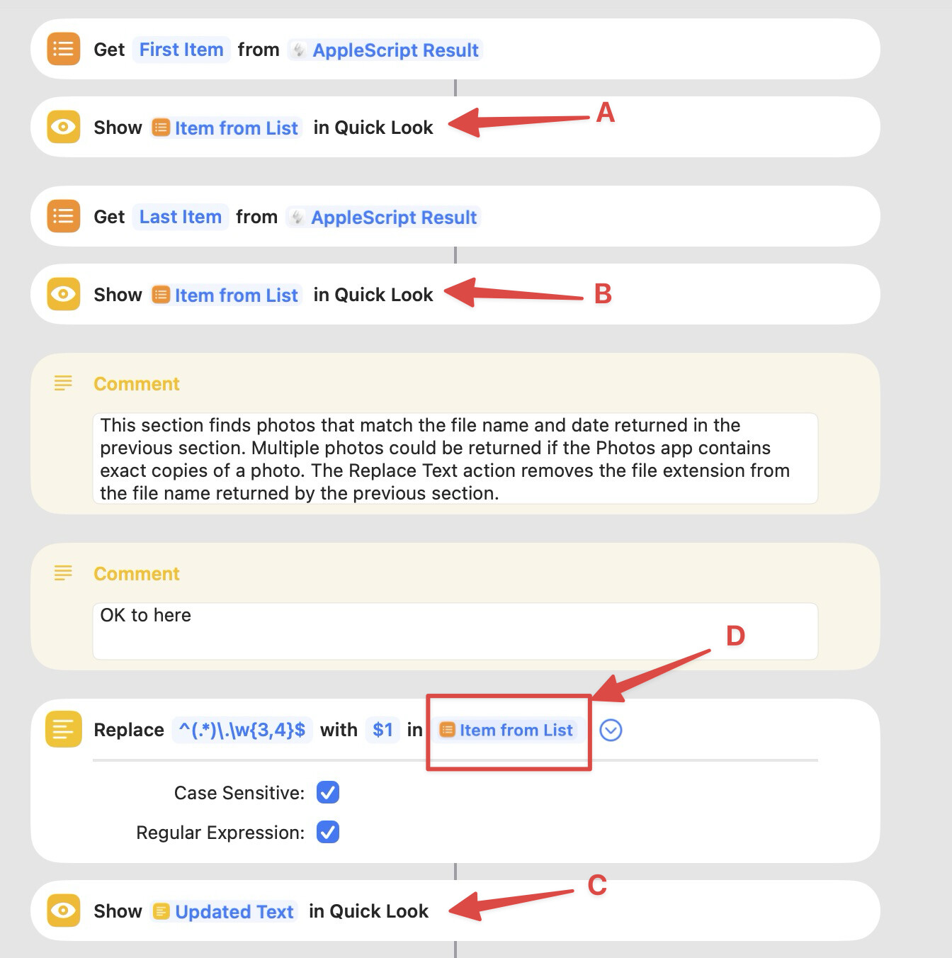 In my revised shortcut, I would probably put your routines after the Find Photos action. The Get First Item action wasn’t really necessary, so I deleted it. Your routines could also be put at the very end of the shortcut. This depends on when you actually want to set the keywords of the photos to “Processed”.