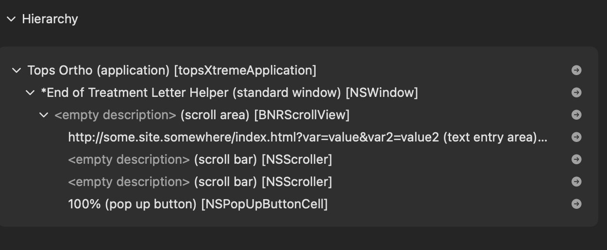 This letter window contains an element that I cannot seem to get to with AppleScript. Ideally I would like to capture the value contained in this element (in this case the url https://some.website.somewhere/indext.html?var=value… ) and then subsequently open the URL in Safari.