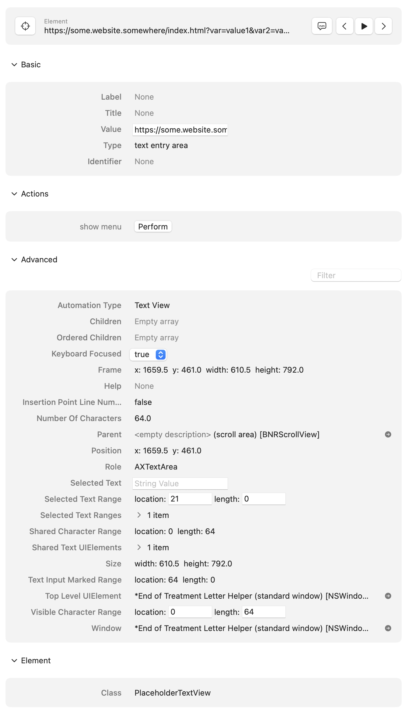 This element is a text area (dashed line around the outside). When double clicking on it then inspecting it with Accessibility inspector it is AxTextArea and I’m trying to get the Value property which contains the string/URL