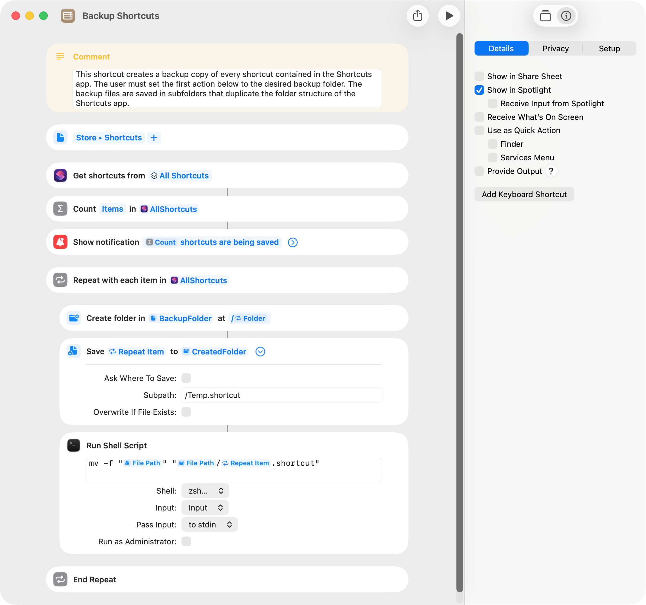 As with those posted above, the shortcut included below creates backup copies of all shortcuts in the Shortcuts app. These backup files are saved in subfolders that duplicate the folder structure of the Shortcuts app.