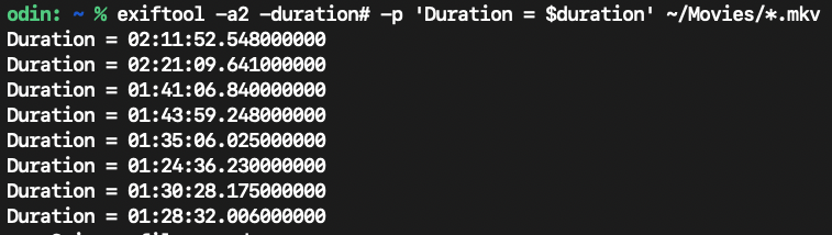 And an example of using ExifTool to extract the duration data for each of .mkv movies in a Movies folder with an internal ExifTool loop: