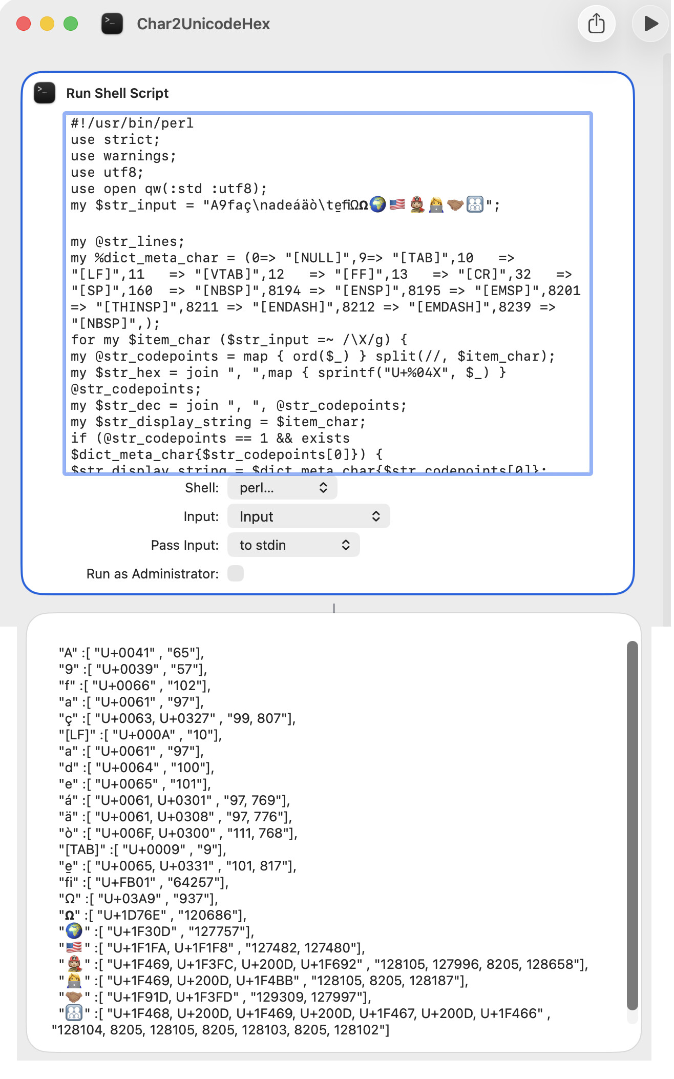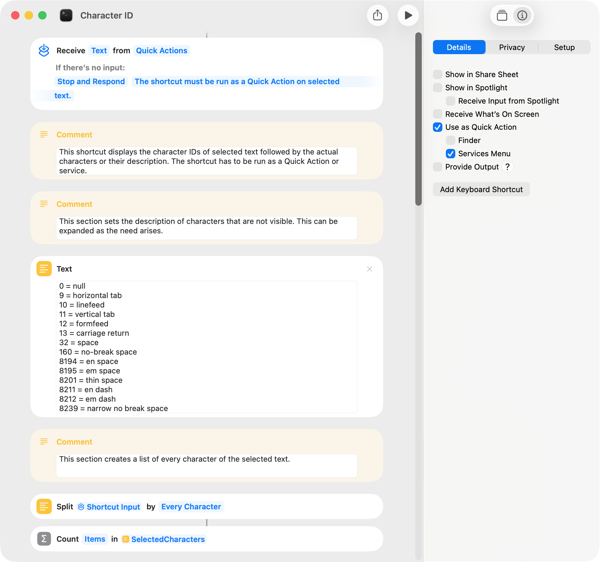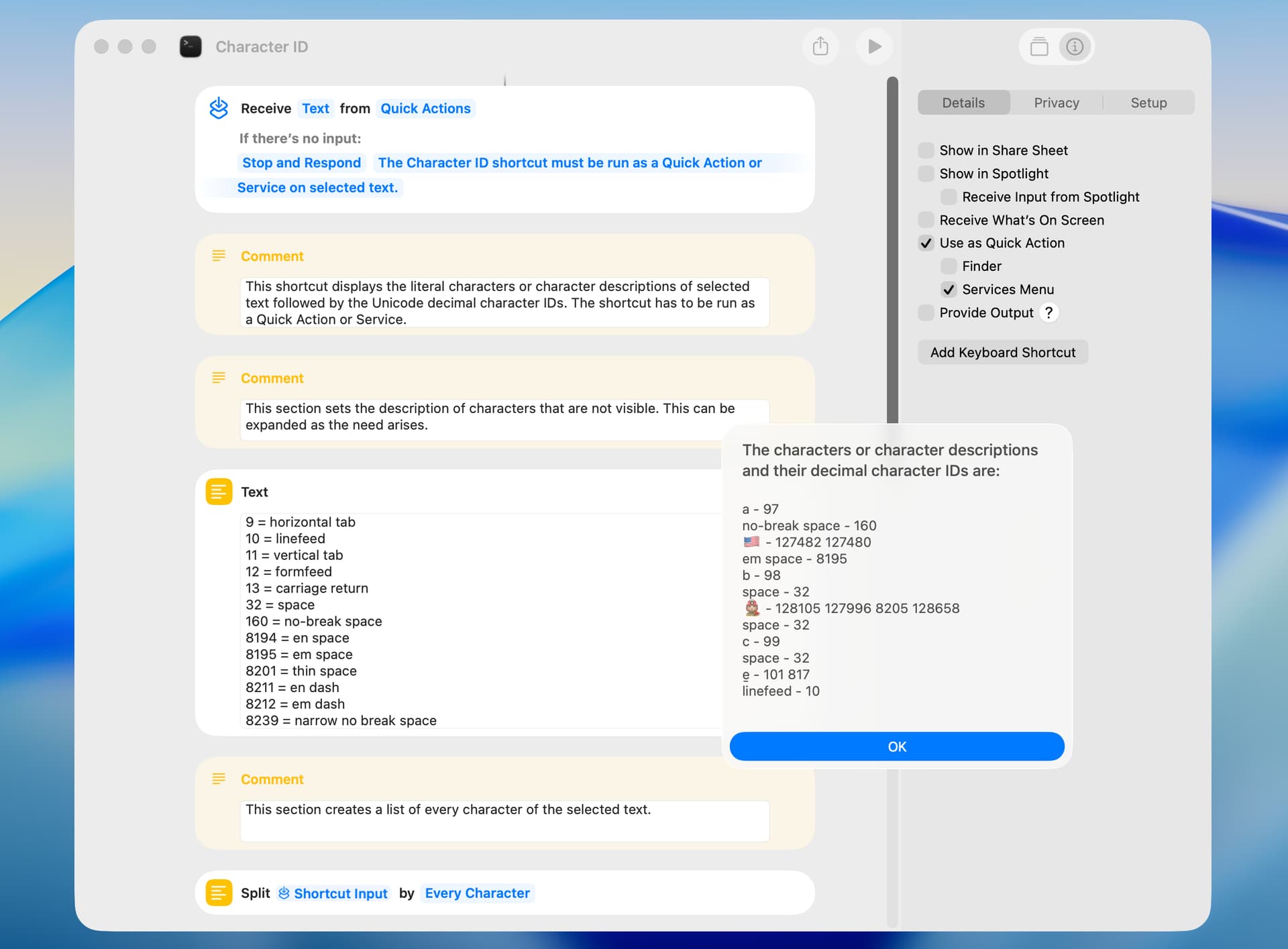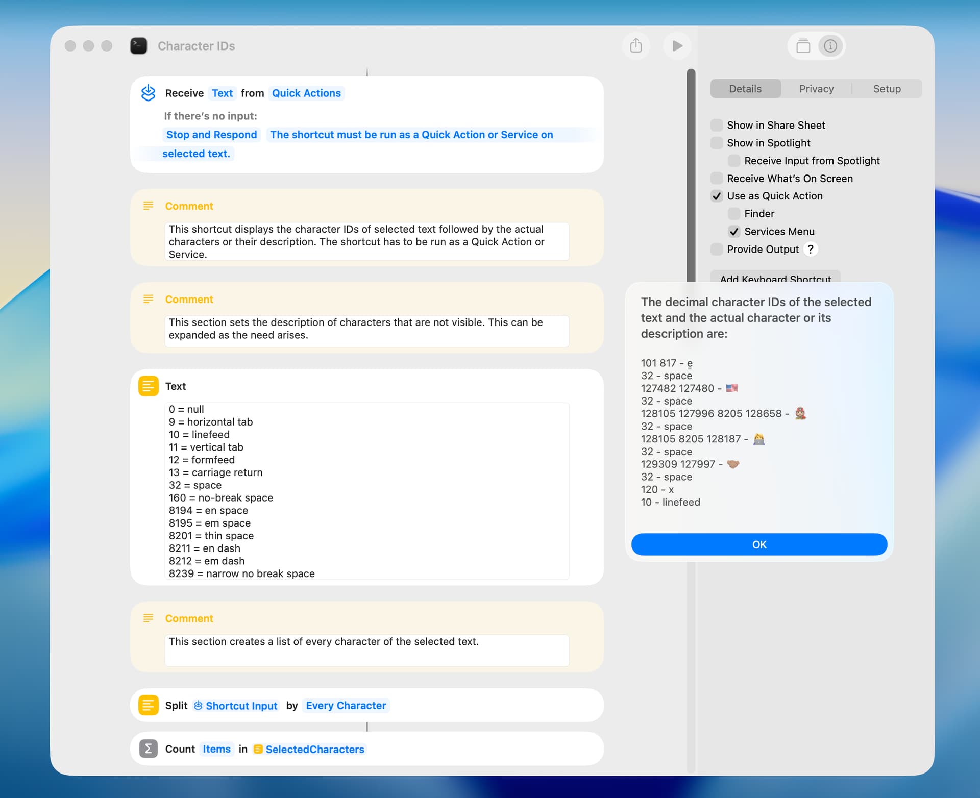 To reduce execution time, the shortcut creates a list of characters and a list of character IDs. An error is reported if the number of items in these lists are not the same. A more reliable approach would be to get the character IDs with AppleScript (or the shell), and then to get the corresponding character with an AppleScript, but that approach was slow. If things get out of sync it would probably be obvious.