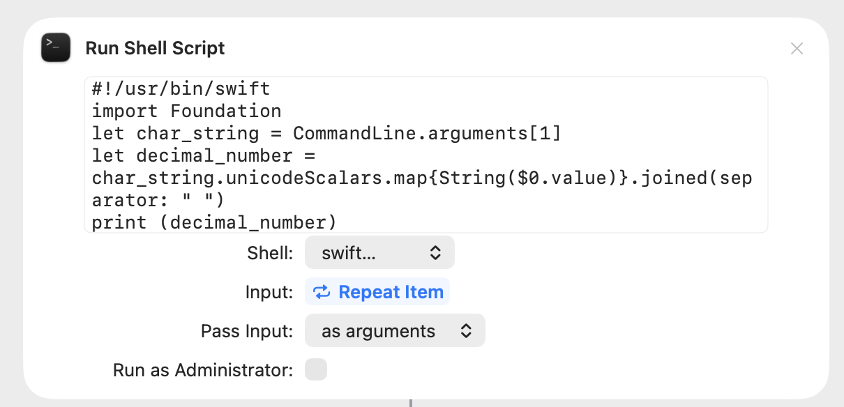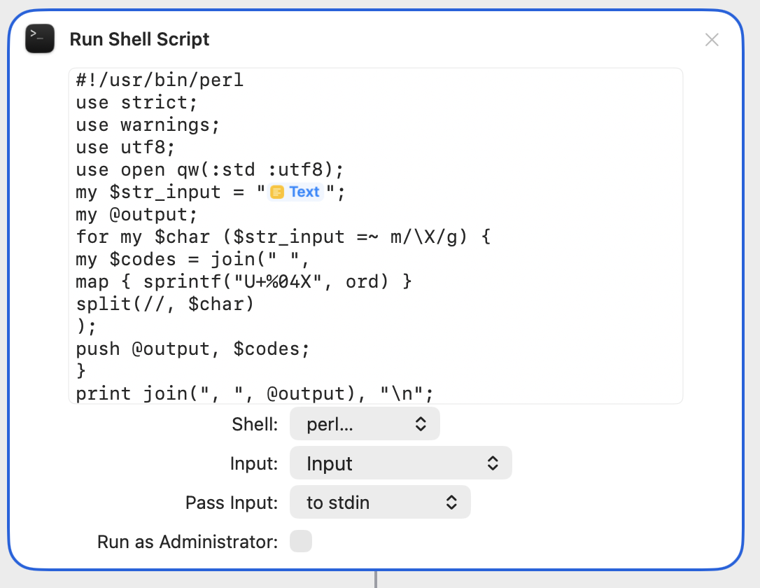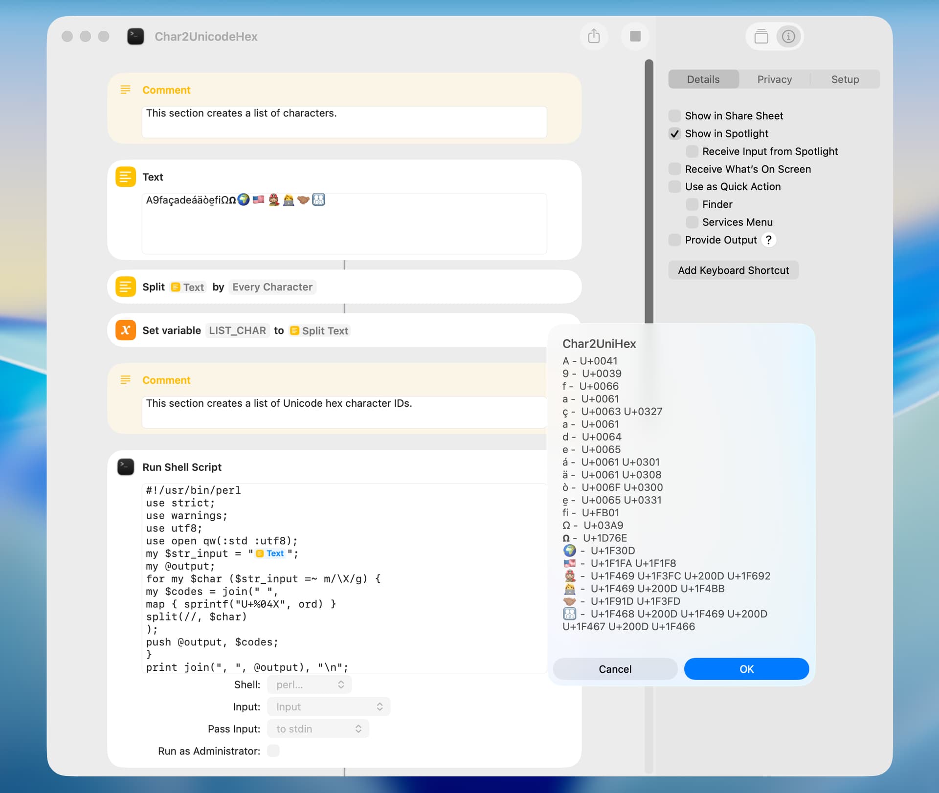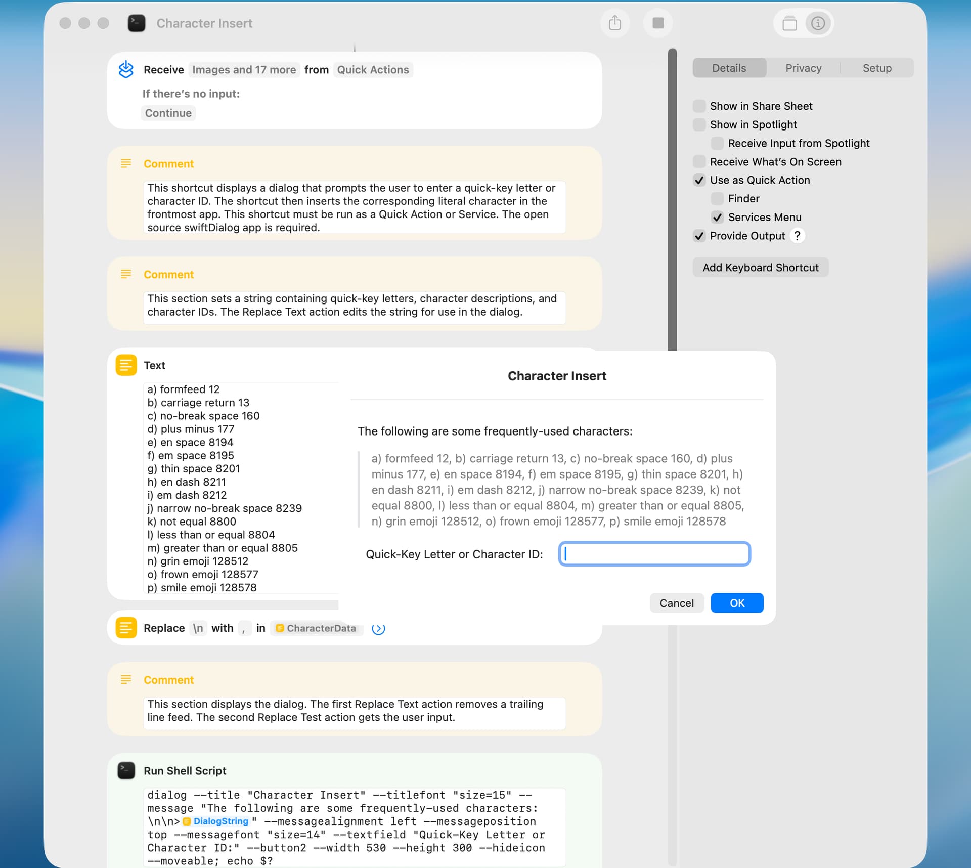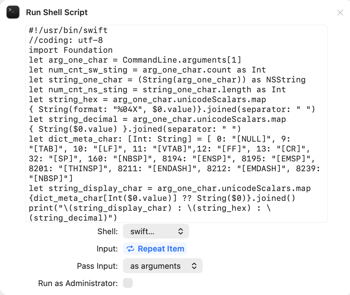 To reduce execution time, the shortcut creates a list of characters and a list of character IDs. An error is reported if the number of items in these lists are not the same. A more reliable approach would be to get the character IDs with AppleScript (or the shell), and then to get the corresponding character with an AppleScript, but that approach was slow. If things get out of sync it would probably be obvious.