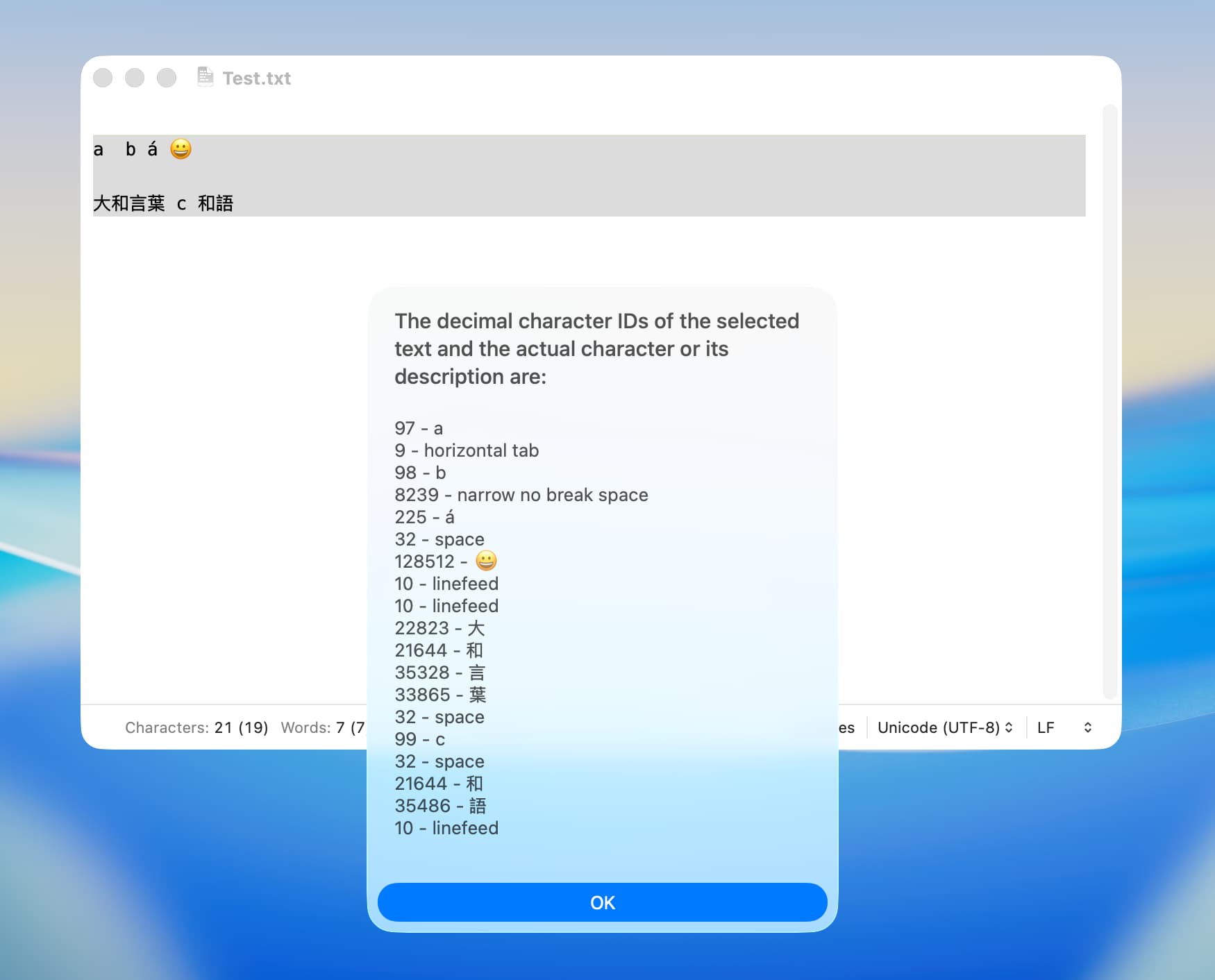 Just as an interesting project, and for occasional use, I wrote a shortcut that displays the decimal ID of characters of selected text followed by the actual character or its description. For example: