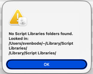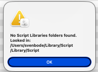 display alert "No Script Libraries folders found." & linefeed & "Looked in:" & linefeed & userLibFolder & linefeed & systemLibFolder buttons {"OK"} as critical