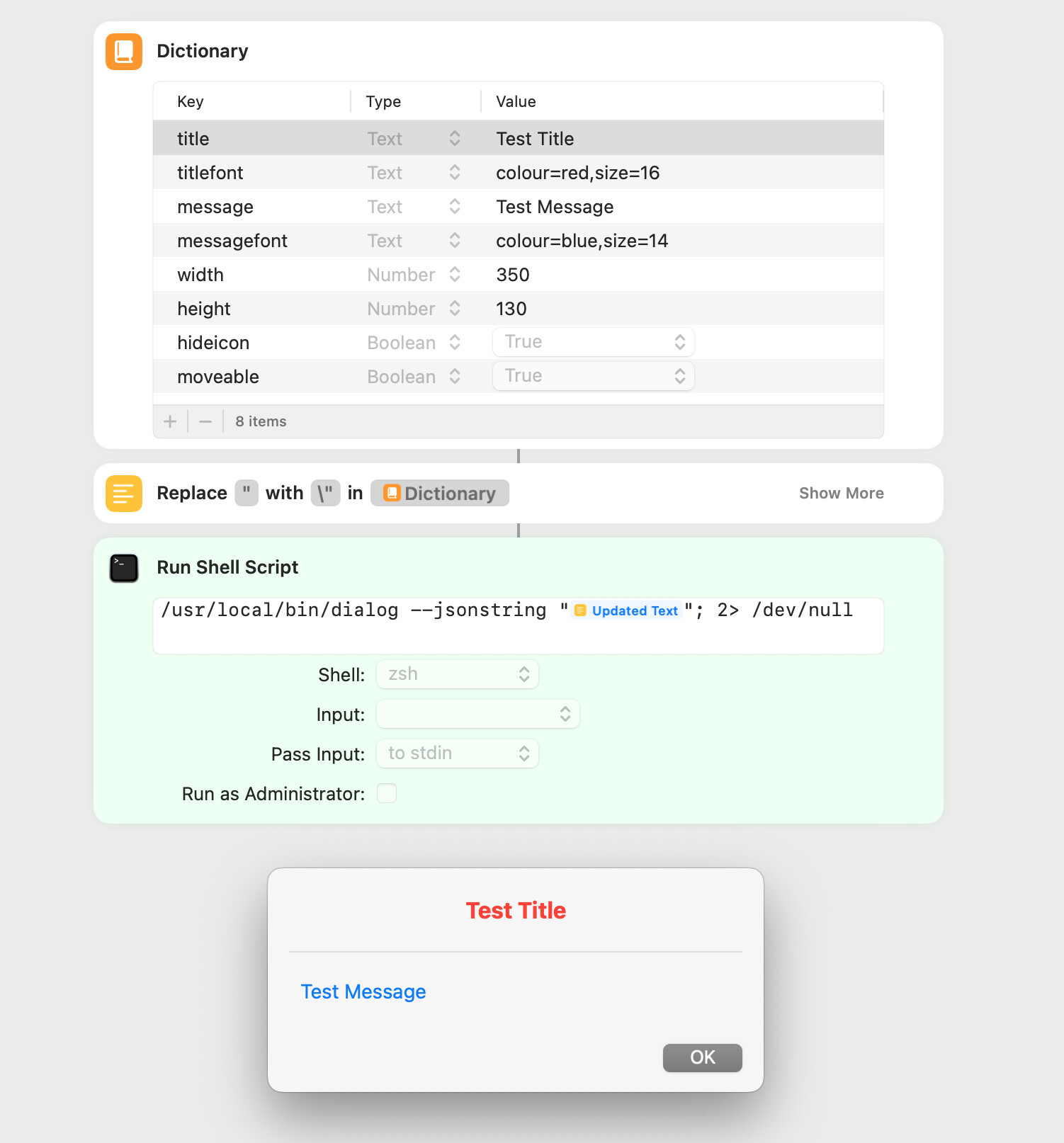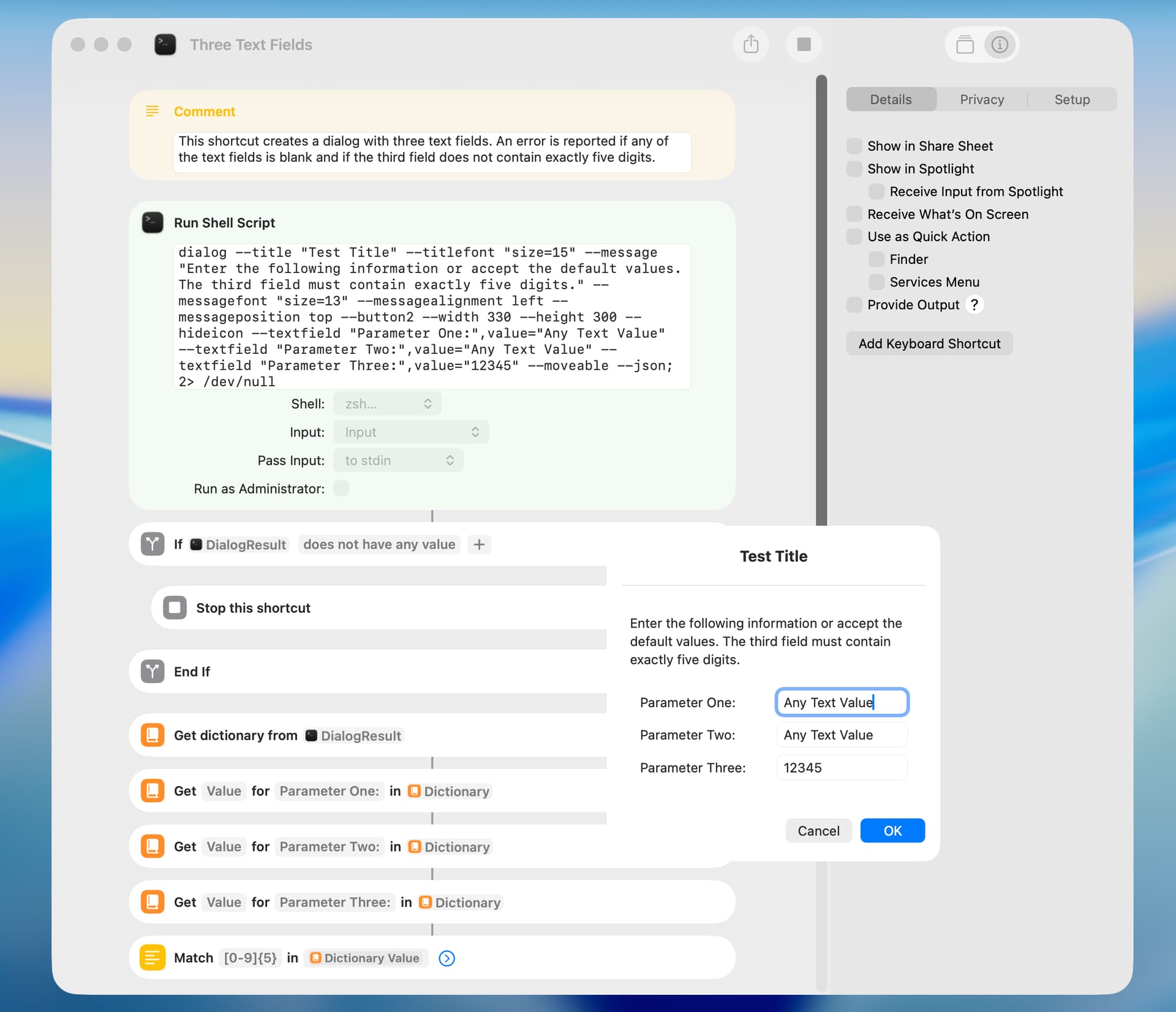 The Shortcuts app has an Ask for Input dialog, but it’s pretty limited. SwiftDialog allows you to do much more, and the following is only a simple example. The output of the dialog is set to be a JSON, which is then made into a dictionary with the Get Dictionary from Input action. Standard error is redirected to /dev/null to prevent the shortcut from stopping and reporting an error if the cancel key is selected. Additional error handling is still needed, though.