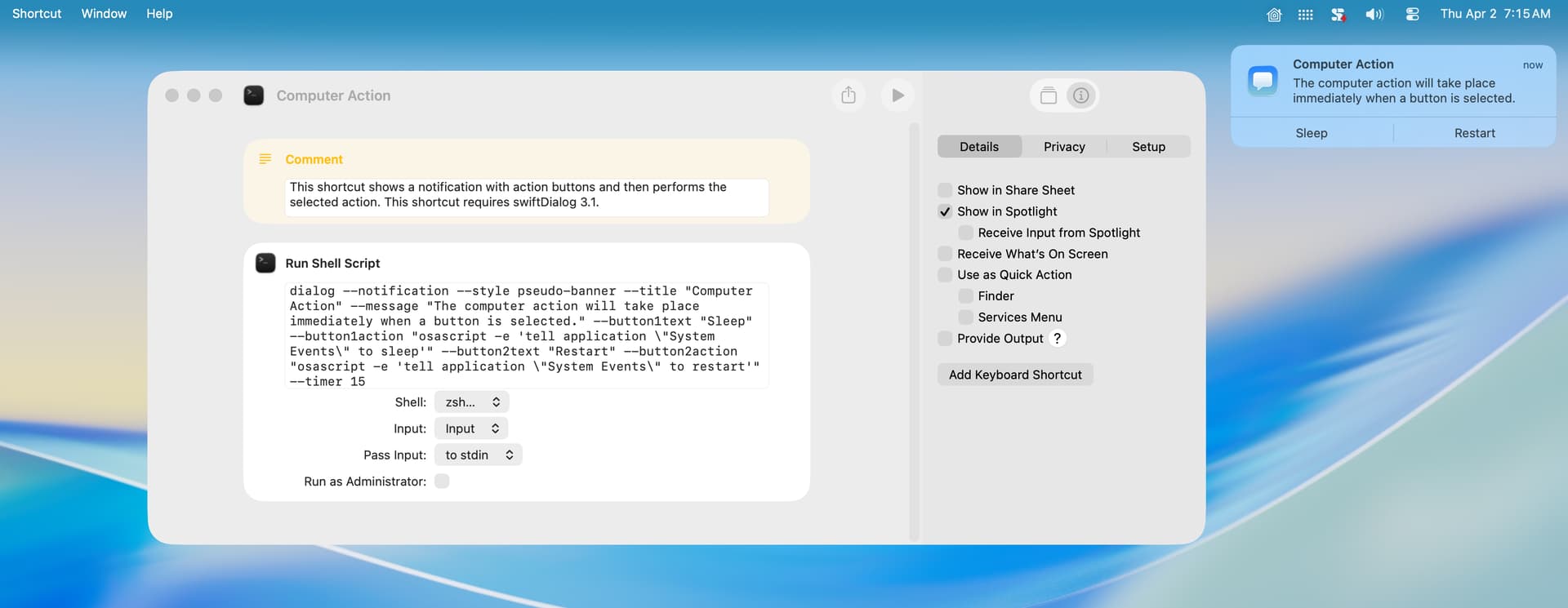 So, I have a project for tomorrow’s morning coffee. I’ll be installing the swiftDialog app and first playing around with your Shortcuts, then seeing if I can work them into some of my AppleScripts. Thank you for posting this.