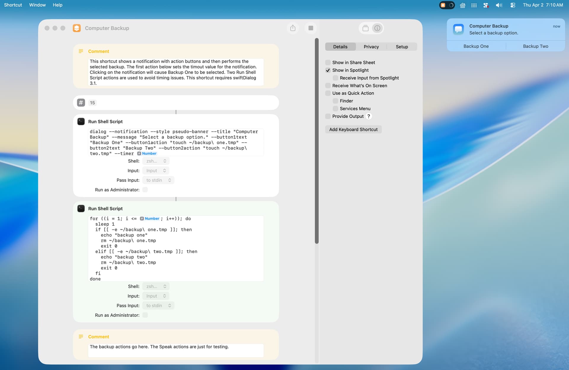 The second shortcut performs a backup (the backup actions are omitted for testing purposes). This is a bit convoluted because swiftDialog does not return the action button selected. A better approach is to put the backup actions in a separate shortcut and to call that shortcut by way of the shortcuts shell command. It might also be possible for the shortcut to call itself with the shortcuts shell command and an input parameter to perform the backup. I’ll work on that.