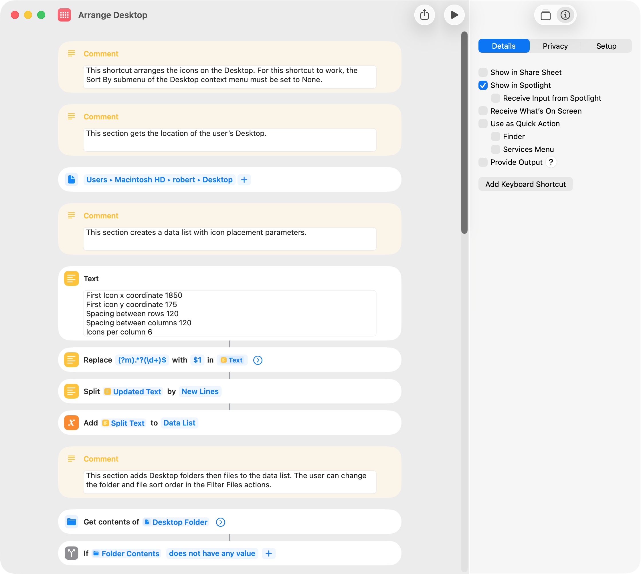 Primarily for learning purposes, I rewrote my shortcut in post 1 to set icon placement values at the beginning of the shortcut. The learning part was how to input five numbers and a list of folders and files into a Run AppleScript action.
