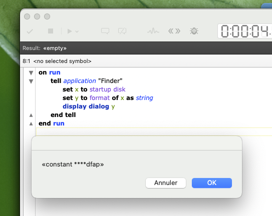 ^ this returns “APFS format” in the script editor, but “«constant ****dfap»” in an applet. I had to use “run script” to run the format lookup and return that to my regular script. It does work but I can’t see how it works or why it’s necessary.