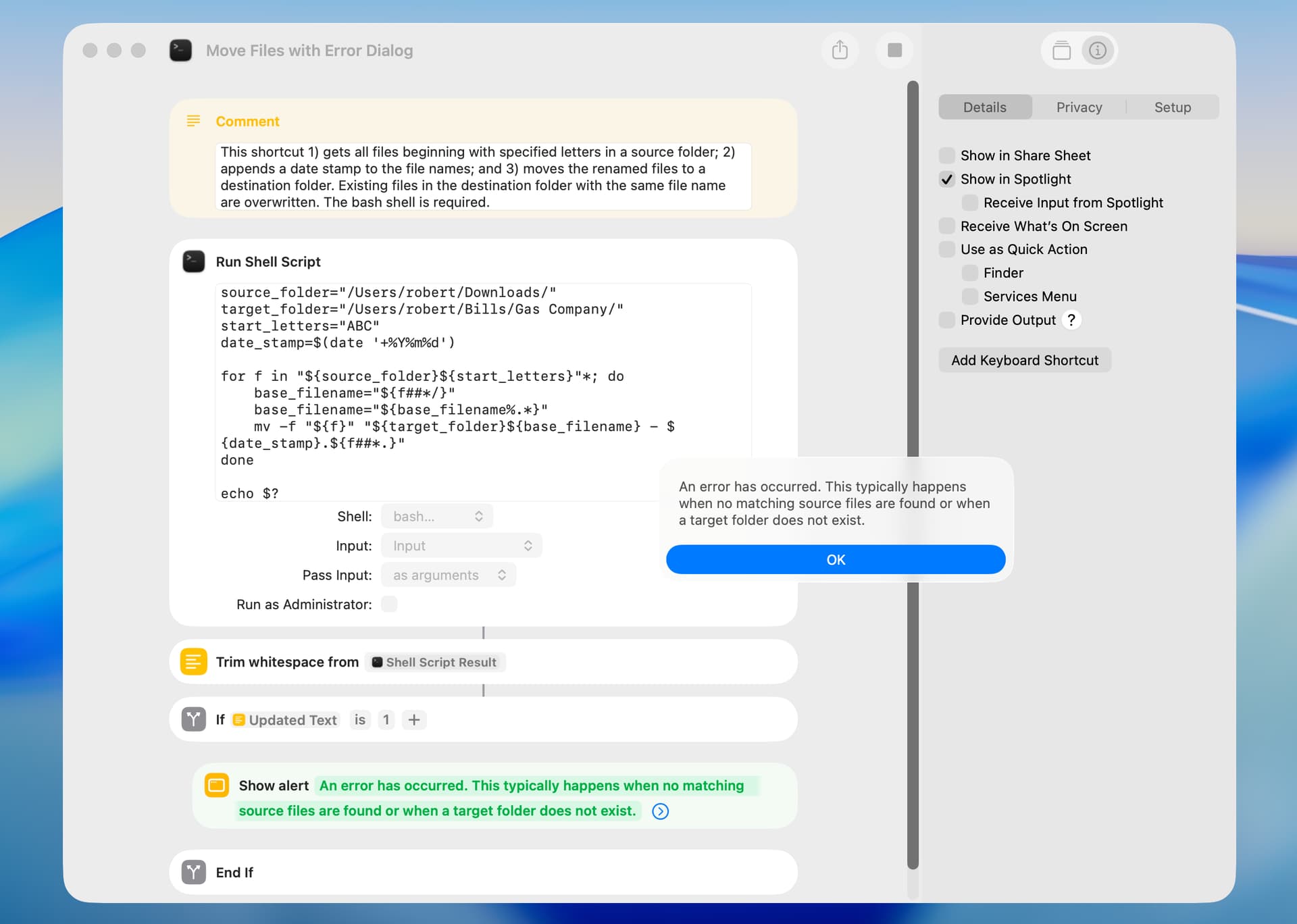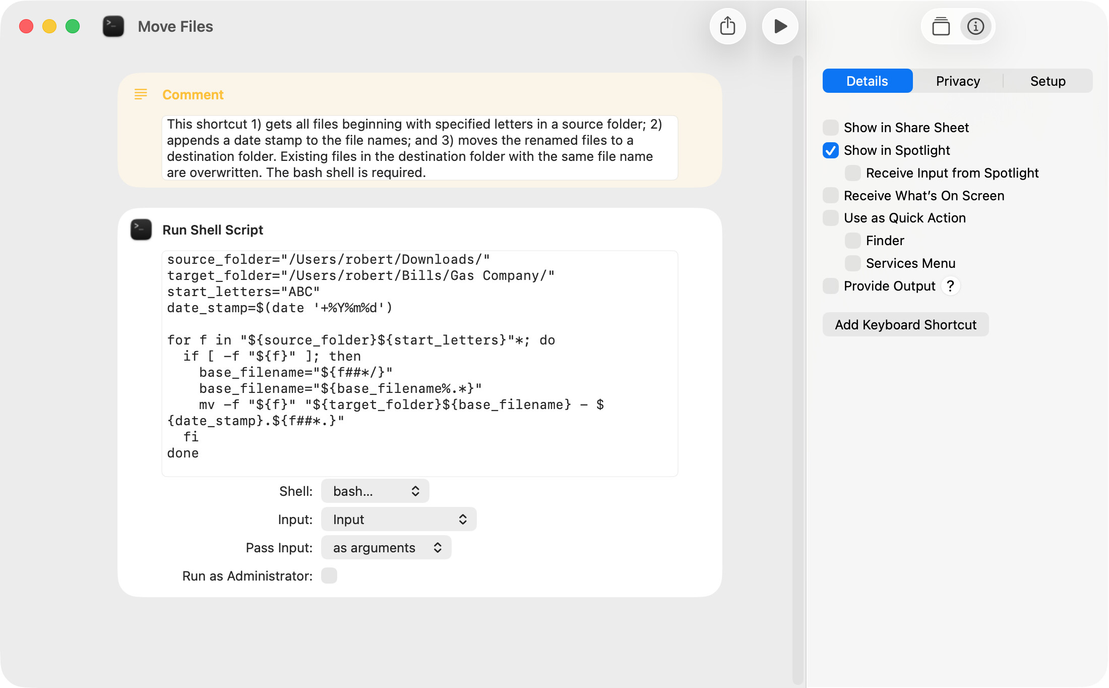 silvercoyote. It’s not clear to me if your request is for a shortcut that renames, dates, and moves files or to get the AppleScript in your post to work. If the latter is the case, the following worked on my computer. There’s no input that I can see, so the shortcut does not return any input.