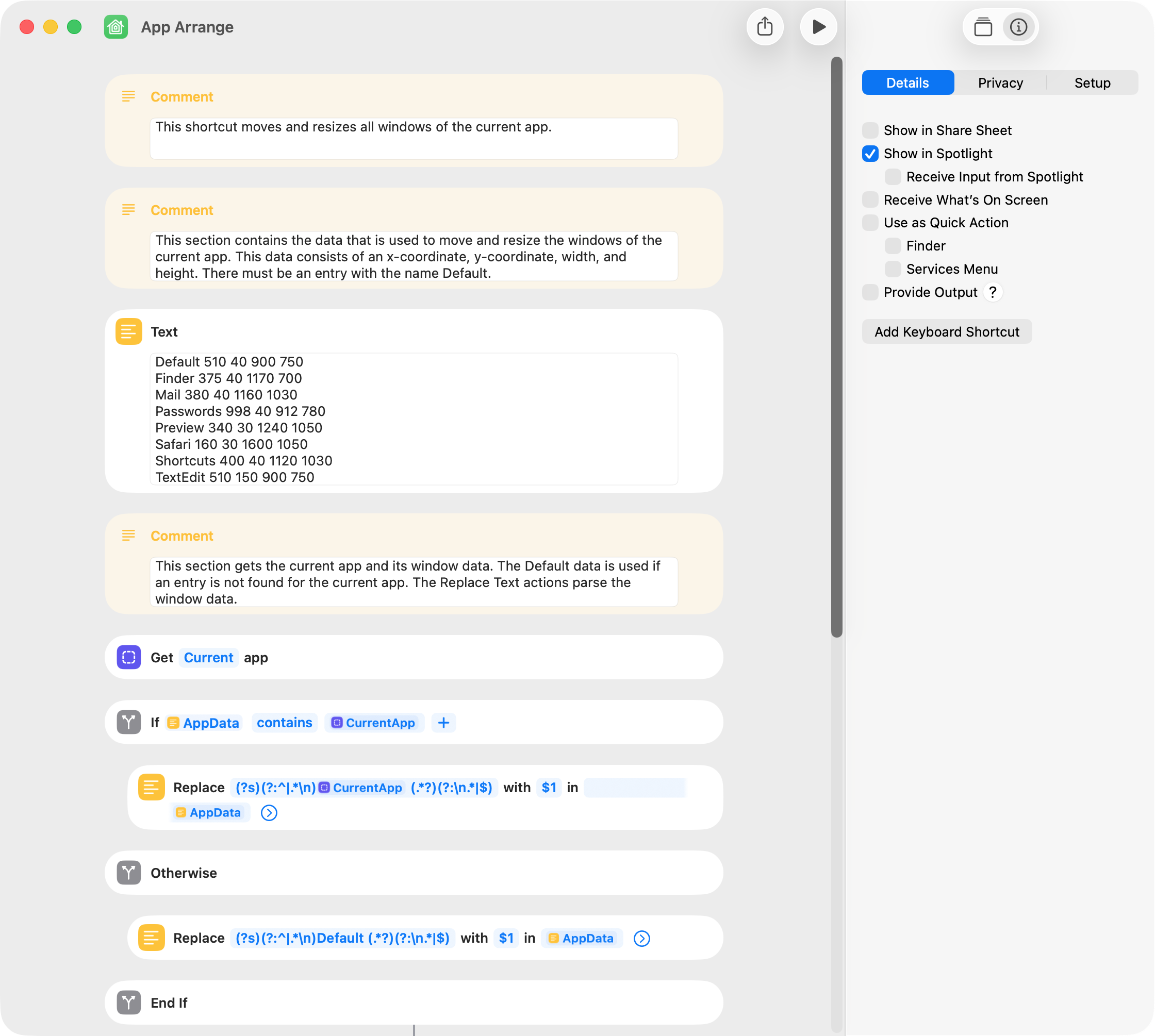 The following is a helper shortcut that can be used to get the window data for use in the App Arrange shortcut. For a simple task, it does too much, but I wanted to test solutions to a few items (like the off-center stuff).