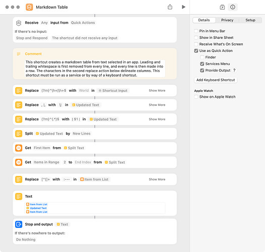 The following shortcut creates a markdown table containing the number of columns and rows specified by the user. It is run as a service or by way of a keyboard shortcut. The shortcut has an intermittent bug that causes the original dialog to appear after an error dialog is displayed. The following screenshot only shows a portion of the shortcut.