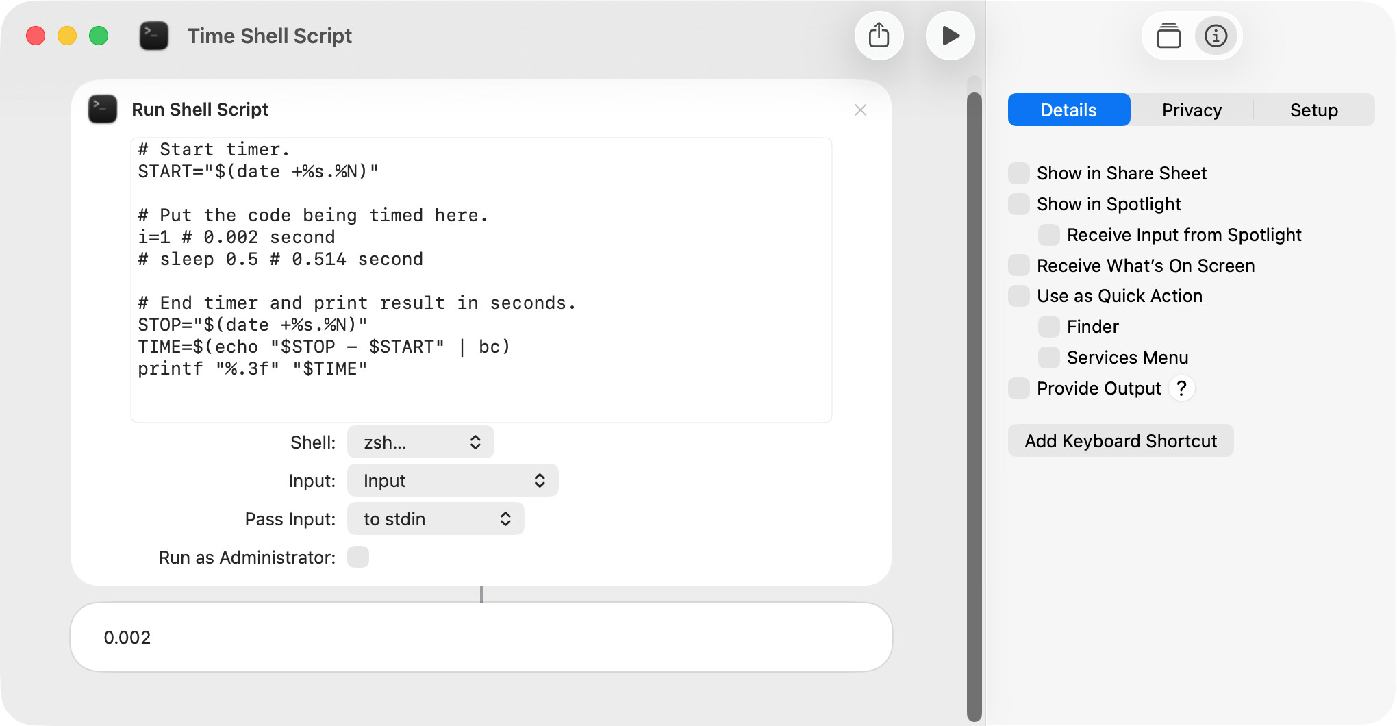 On the other hand, AppleScript’s do shell script command uses Bash, and some users might want to maintain consistency between the shell used by this command and shortcuts.