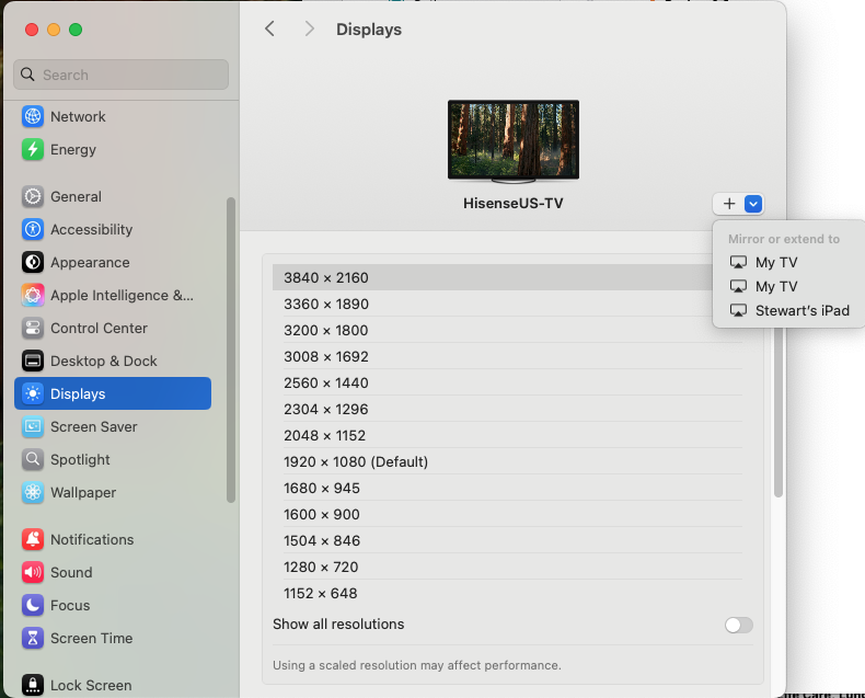 Now, to reconnect I must go to System Settings → Displays, click the blue down-arrow and select “Mirror or extend to (my iPad)”. How do I do this without seeing the screen? Try as I might, I can’t find a keyboard sequence or shortcut for that down-arrow. VoiceOver works, but is quite tedious and error prone.
