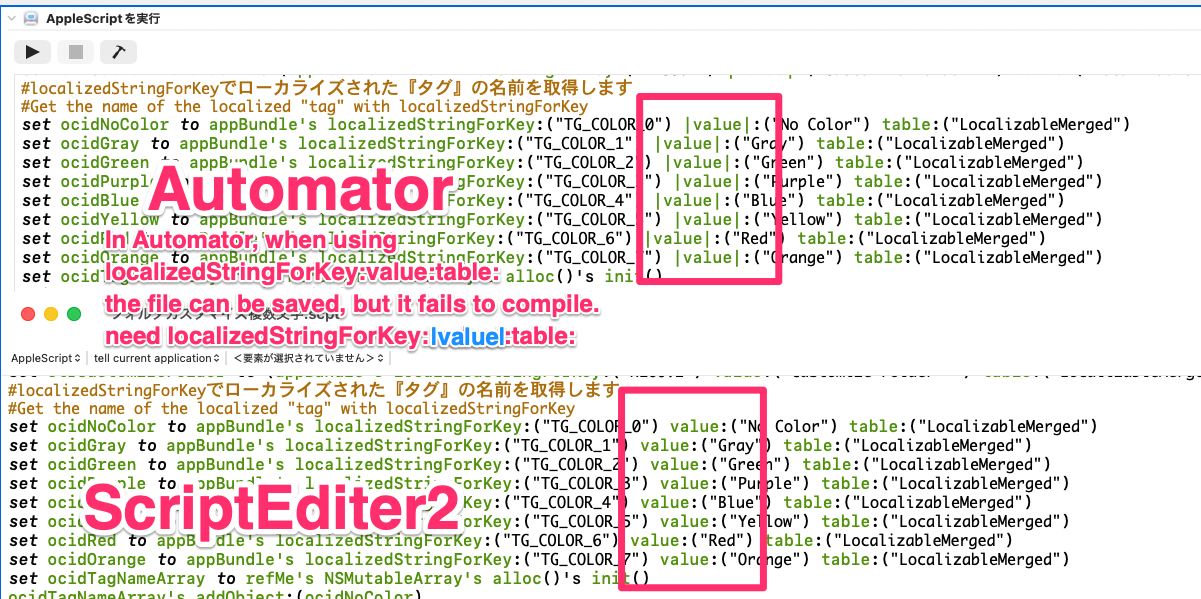 The script editors also don’t help when they remove the pipes that they don’t think are needed, which makes it more fun when switching back and forth with Automator. Switching back and forth also wouldn’t be as much of an issue if the code completion in Automator’s “Run AppleScript” action wasn’t so intrusive, but that is another topic (unless that has been fixed).