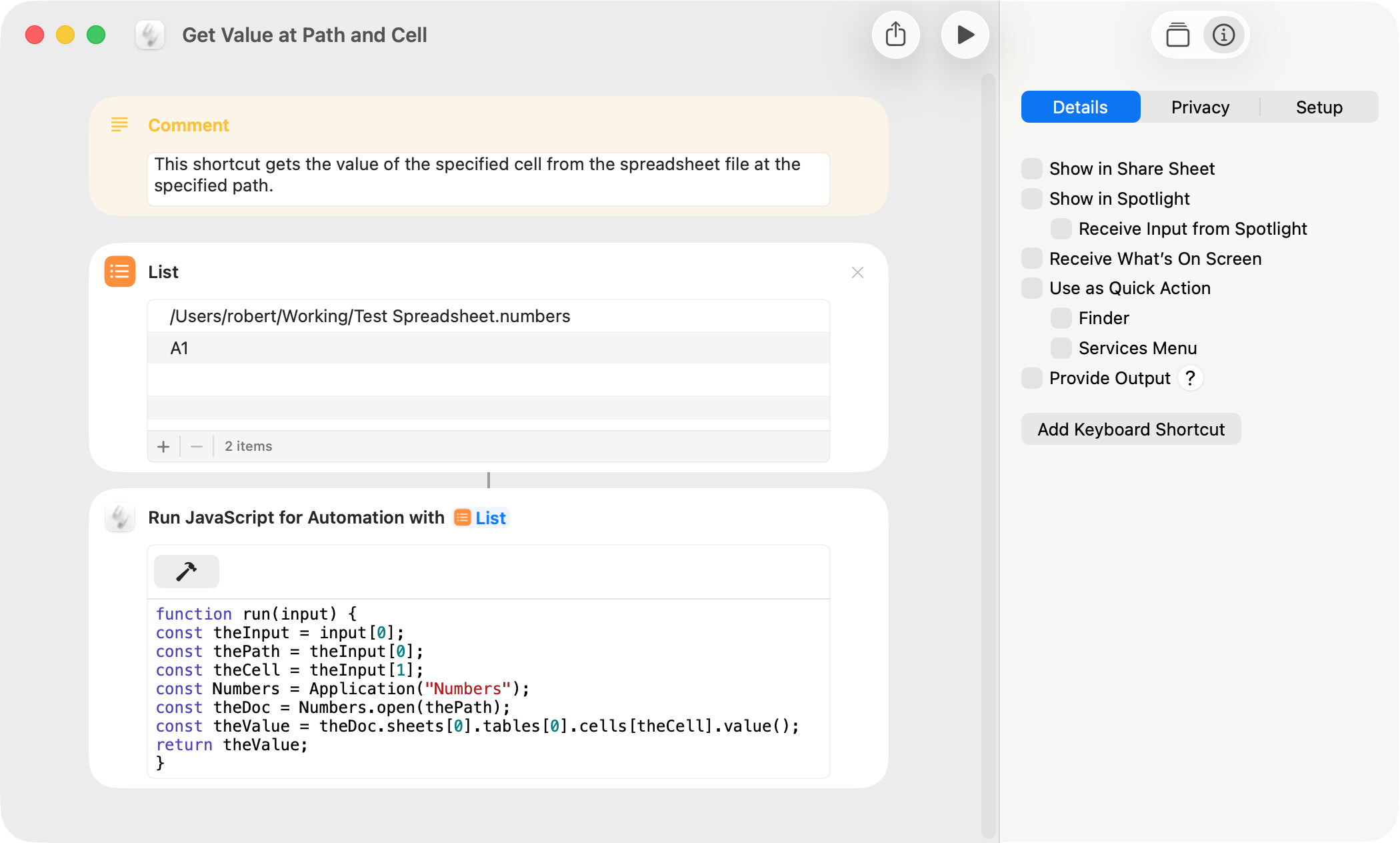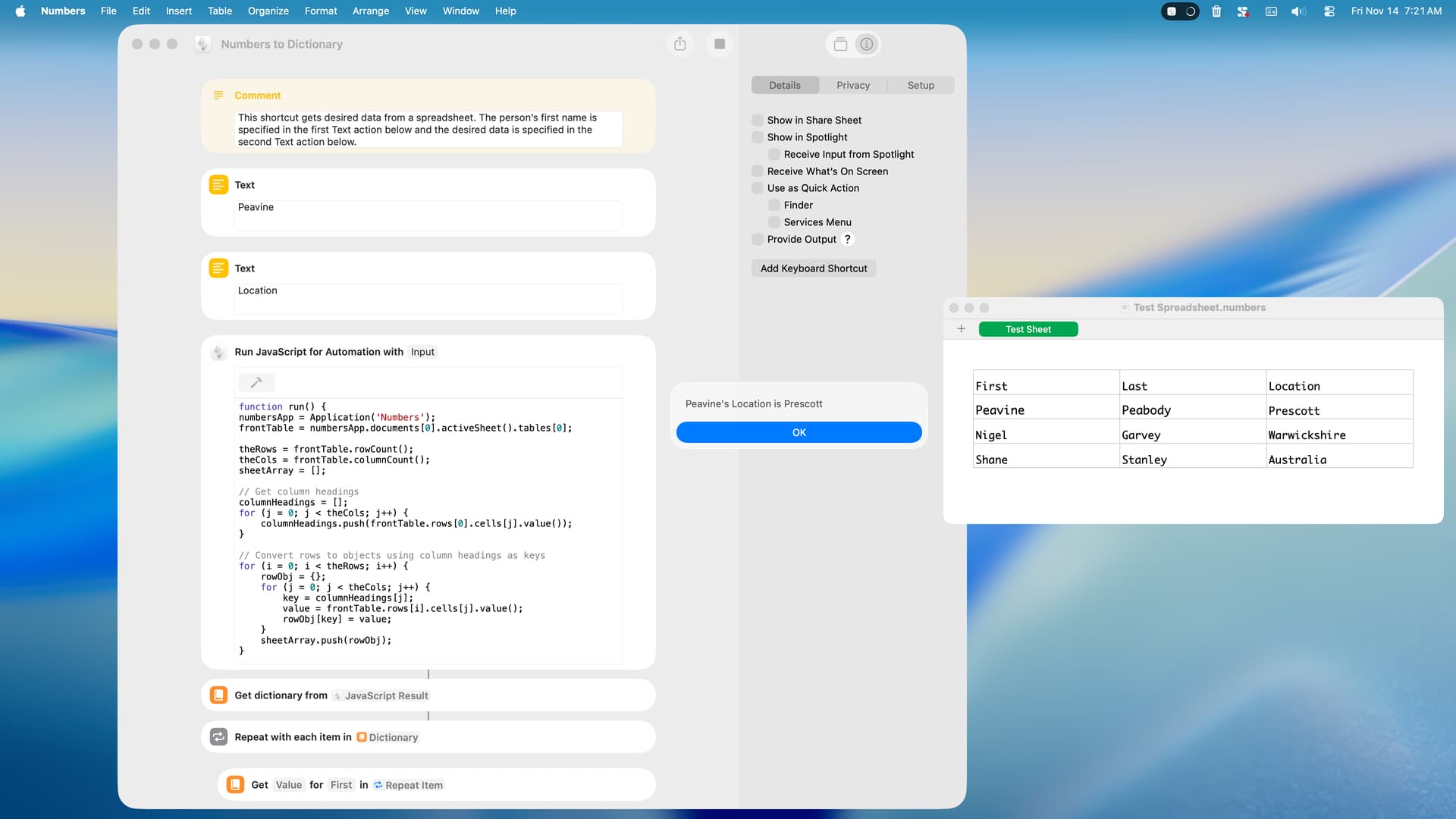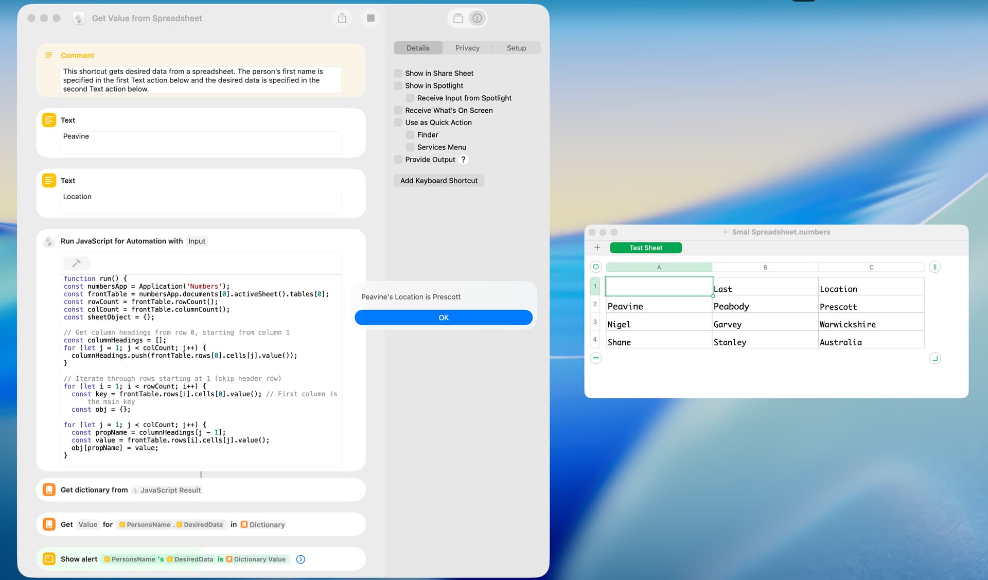 Always glad for a chance to experiment. The first image is the objects. I found that Shortcuts seems to take a bit of time to retrieve the data from the spreadsheet. However, JXA is really fast at it. So the script below, get the data from the spreadsheet, then access “Peavine.location” and puts it in a dialog. That data is sent to a Shortcut called “Handle Text” (The second image). That short cut acts on the text (in this case Capitalize) and then displays an alert from Shortcuts. The data is sent back to the script which then displays the processed data in a dialog. This is runs really quick on my computer.
