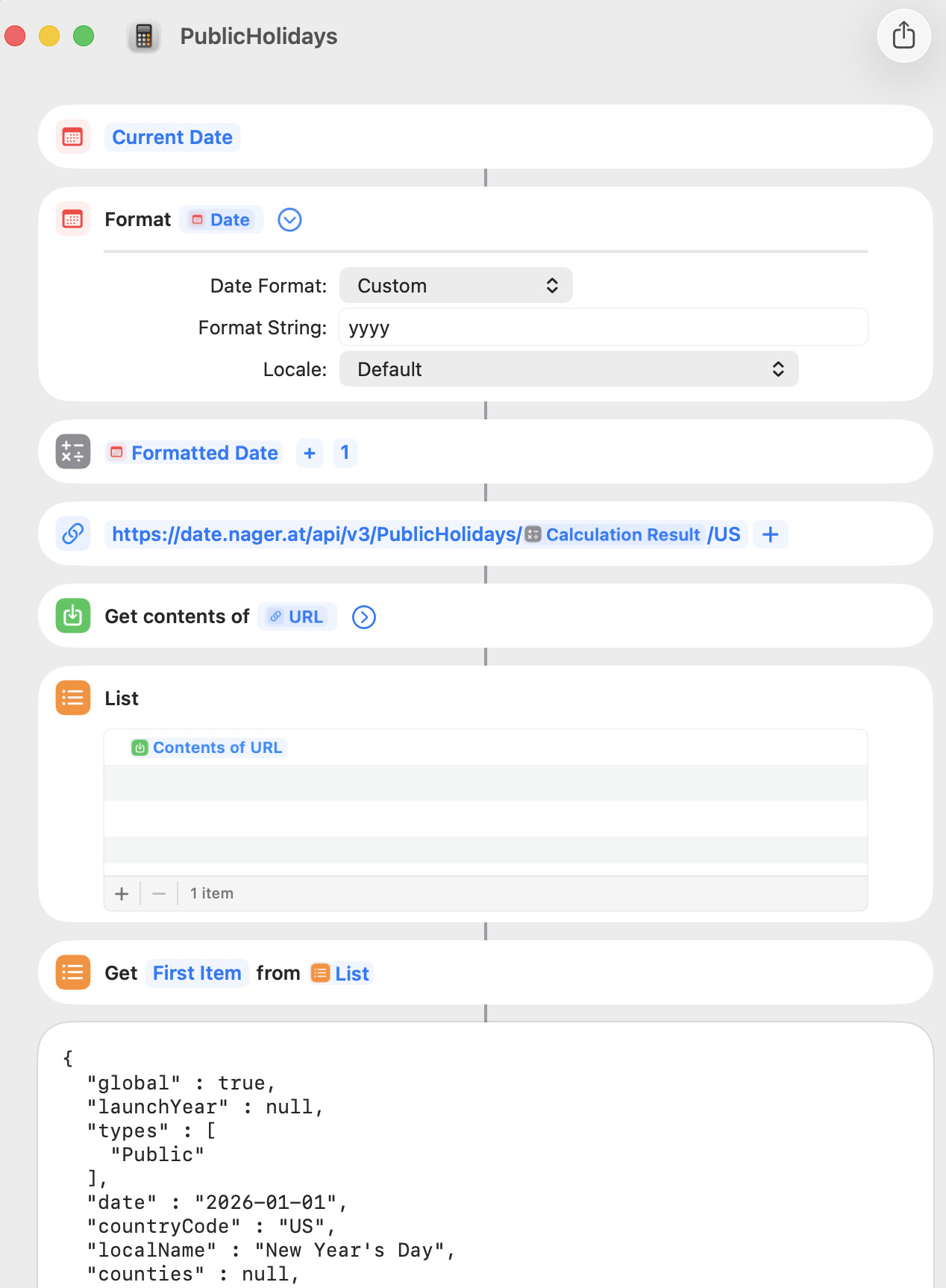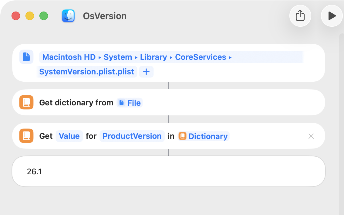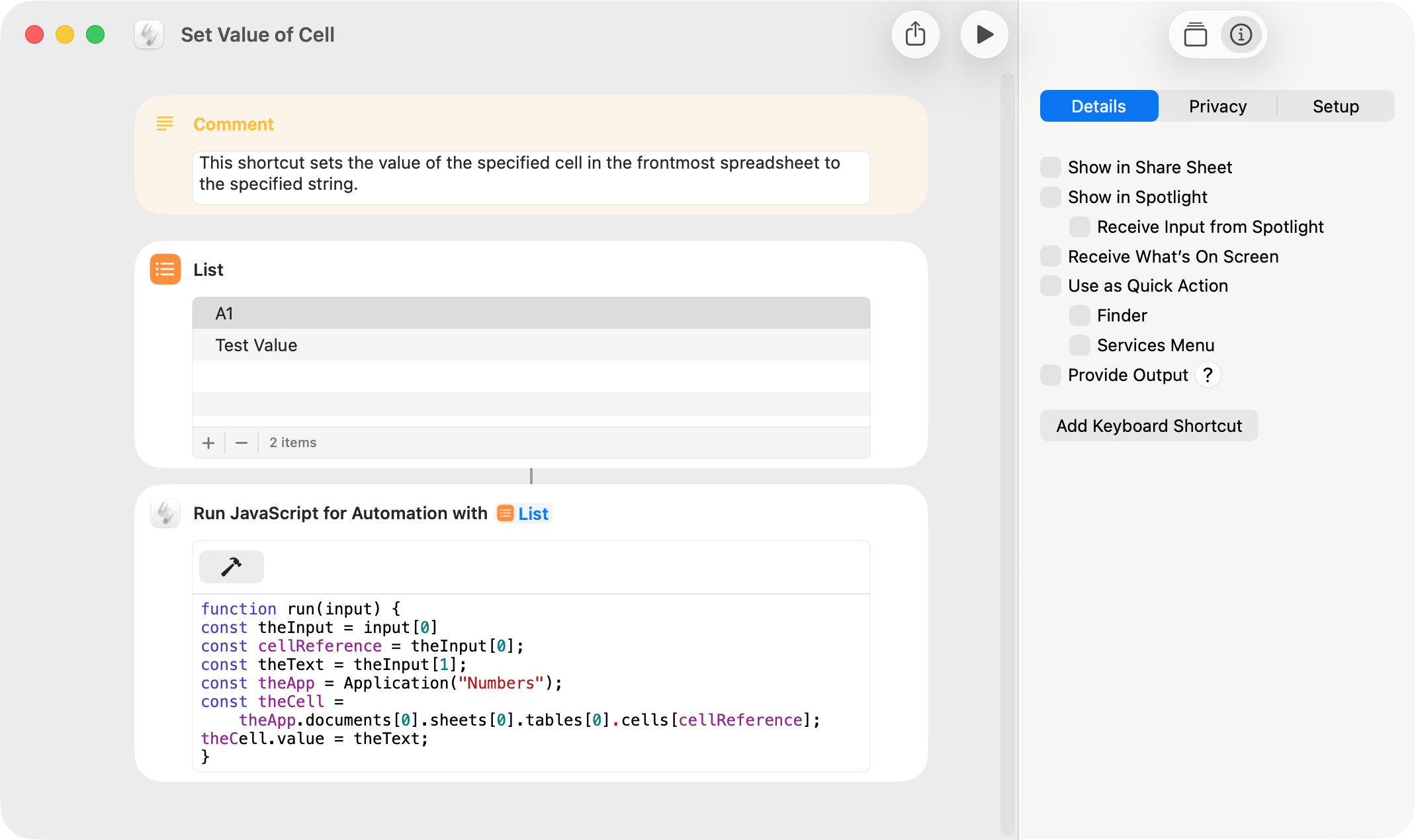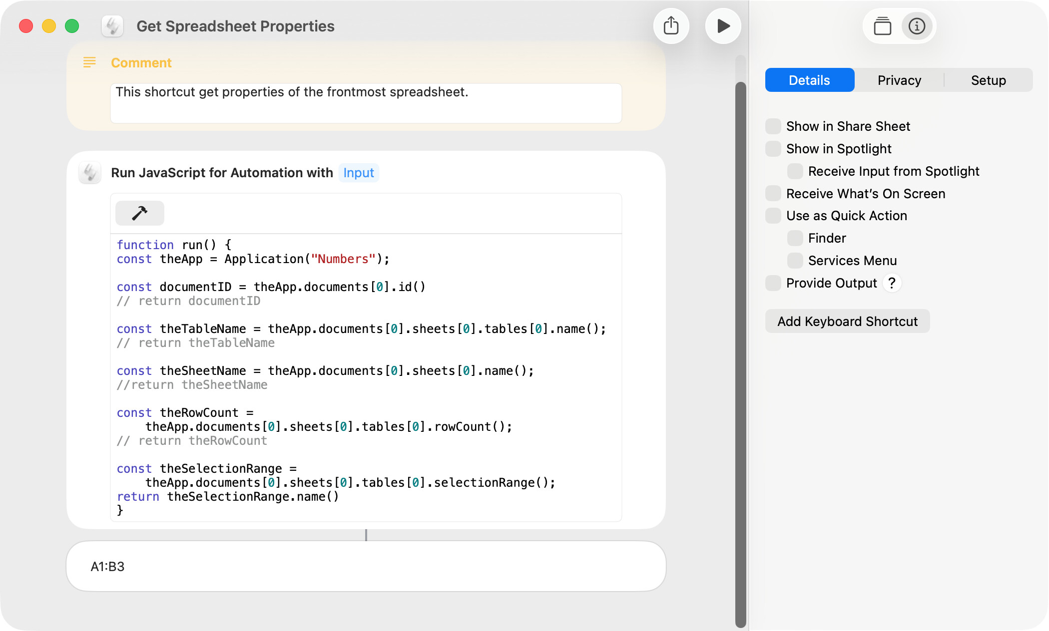 Always glad for a chance to experiment. The first image is the objects. I found that Shortcuts seems to take a bit of time to retrieve the data from the spreadsheet. However, JXA is really fast at it. So the script below, get the data from the spreadsheet, then access “Peavine.location” and puts it in a dialog. That data is sent to a Shortcut called “Handle Text” (The second image). That short cut acts on the text (in this case Capitalize) and then displays an alert from Shortcuts. The data is sent back to the script which then displays the processed data in a dialog. This is runs really quick on my computer.
