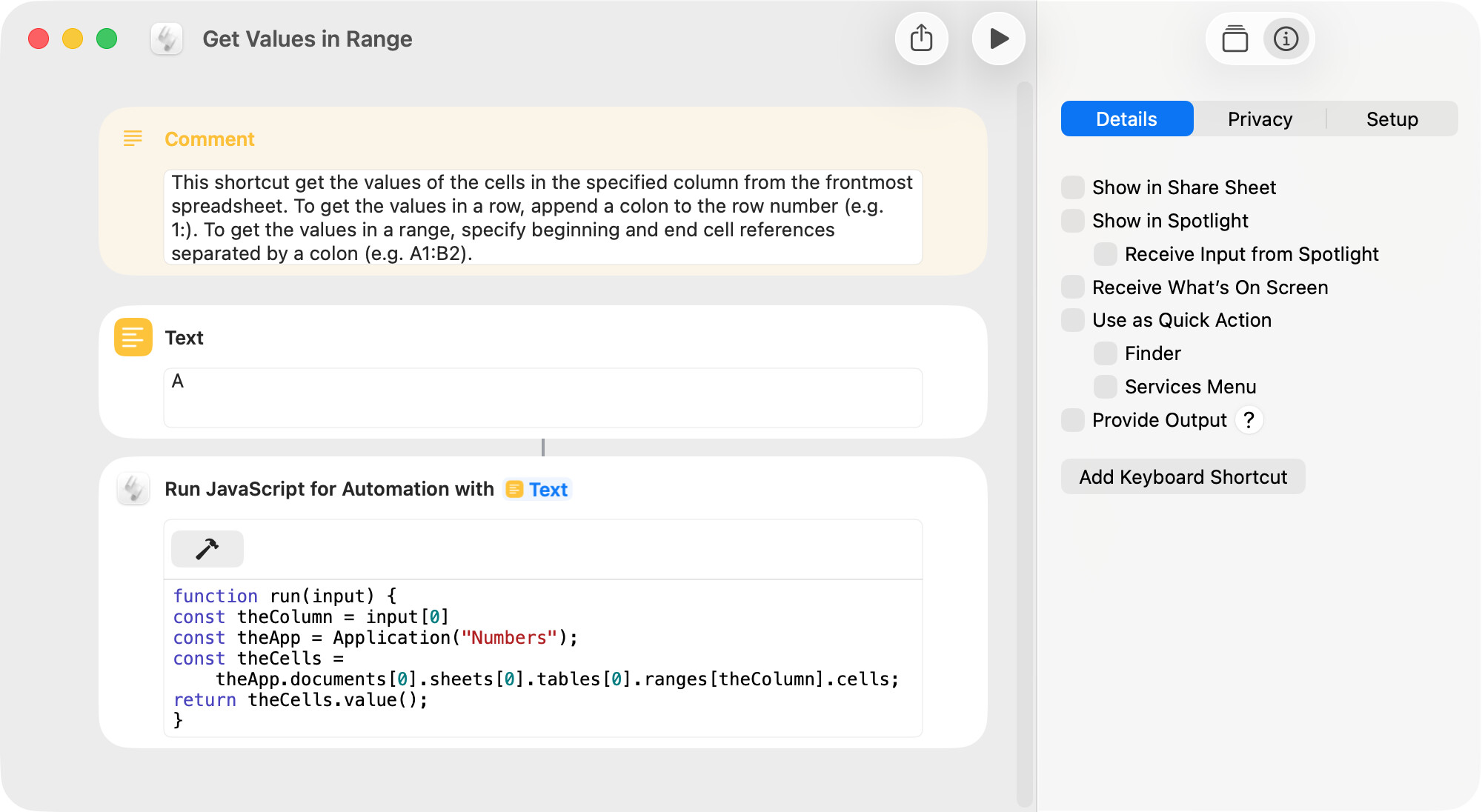 I agree that the shortcut solution is a bit slow. I ran a timing test (after deleting the ending dialog) and the result with my earlier spreadsheet was 0.55 second. I increased the spreadsheet to 5 columns with 50 rows and the result was 2.95 seconds. So, in many cases, the shortcut solution is not usable. I don’t know how to run a timing test on your pure JavaScript for Automation suggestion, but the result when run from within Script Editor with the large spreadsheet appeared to be a second or less.