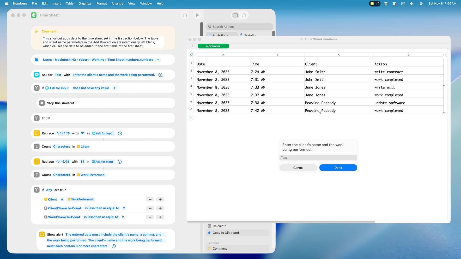 The user enters the client’s name, a comma, and the work performed. The date and time are input by the shortcut.