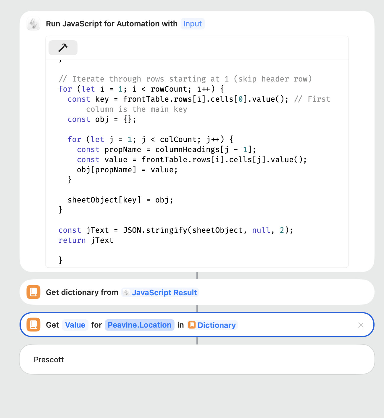 Jesse. I wondered if it would be possible to edit your JavaScript to return an array of objects of objects. Using my above spreadsheet as an example, the first-level object names would be Peavine, Nigel and Shane, and the second-level object names would be Last and Location. In the shortcut, this would permit the use of dot notation (e.g. “Peavine.Location”) to get a value. I hope this makes sense. Thanks!