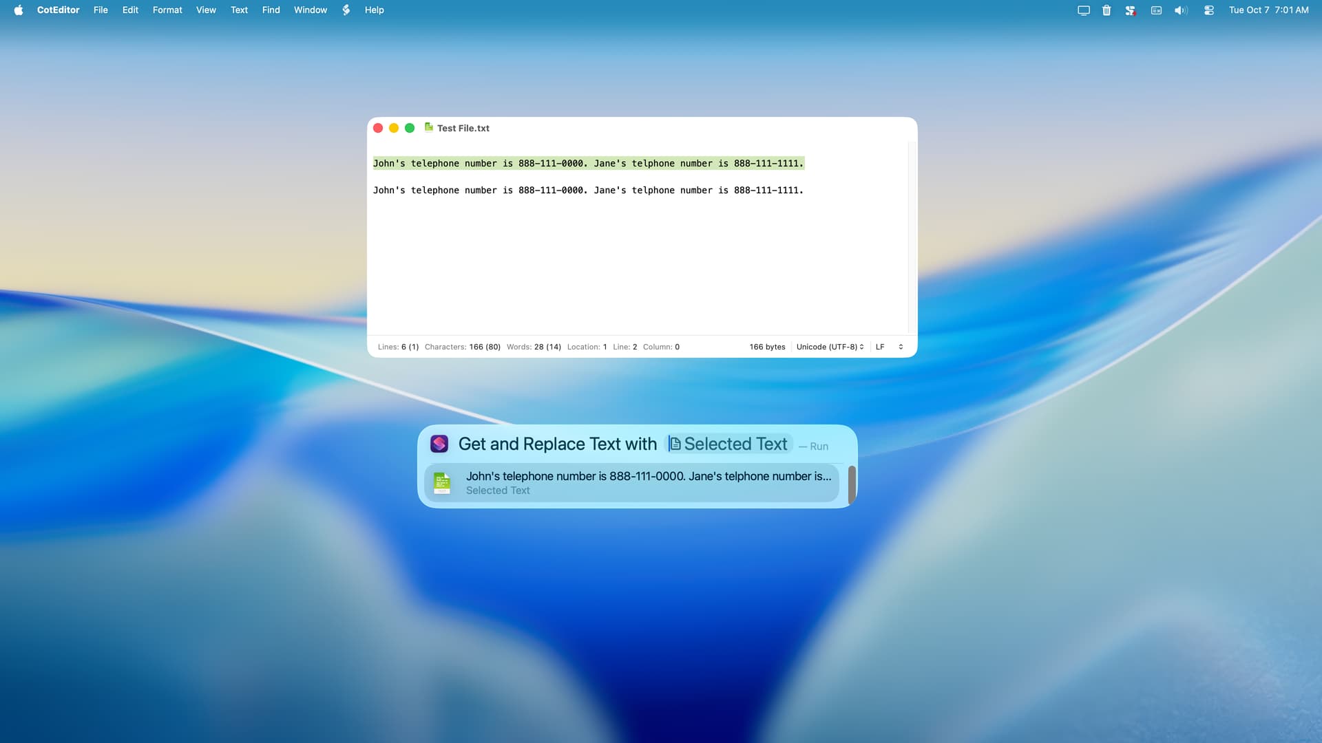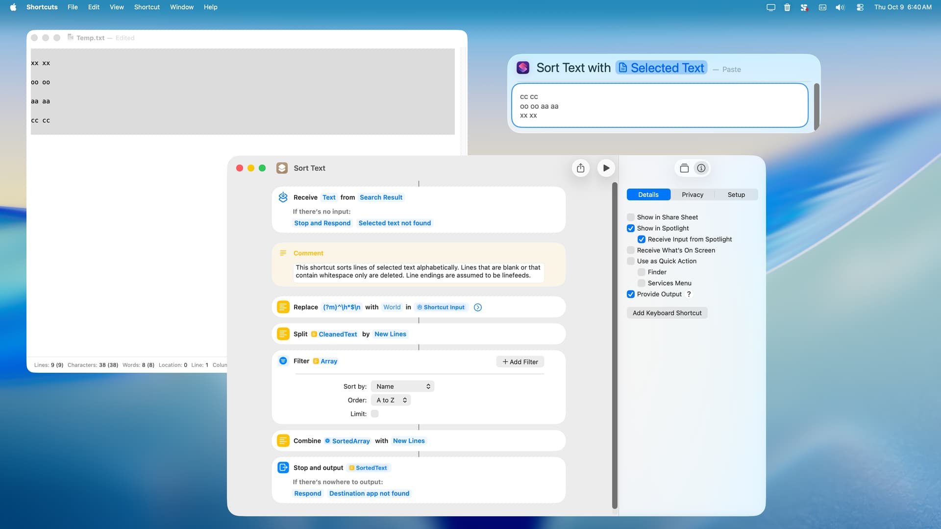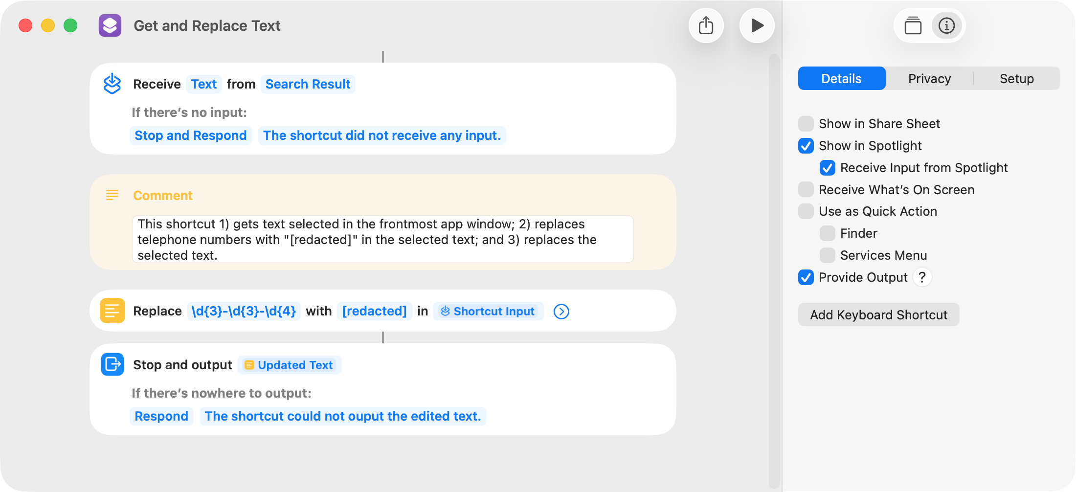It’s always been the case that a shortcut could get and replace selected text in the frontmost app, but the shortcut had to be run as a Quick Action or Service. In macOS Tahoe, the same thing can be done with a shortcut that is run by way of Spotlight.
