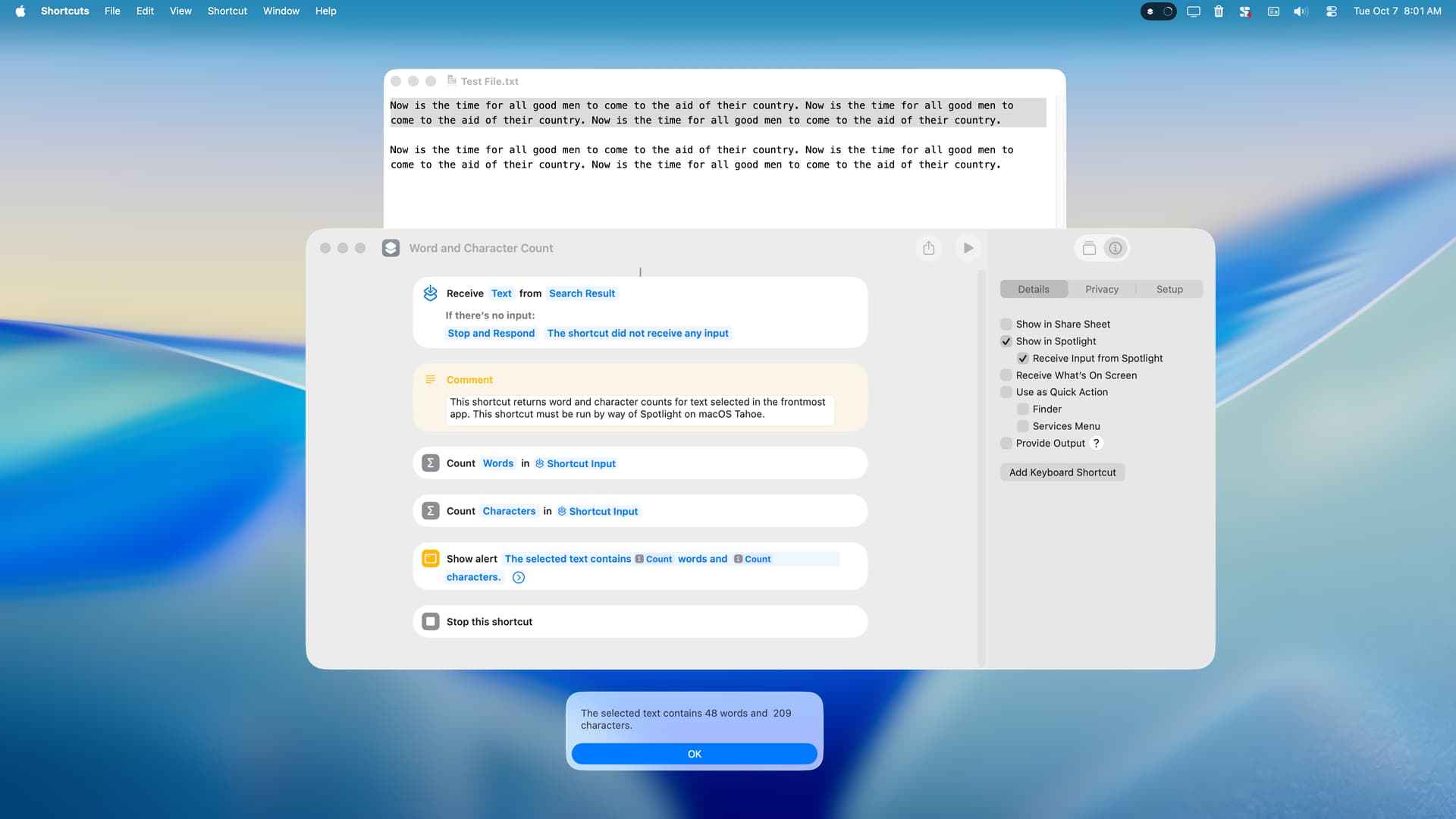 Here’s a working example that counts words and characters in the selected text. Step 4 in the above post doesn’t apply in this instance. The text editor was frontmost when I ran the shortcut.